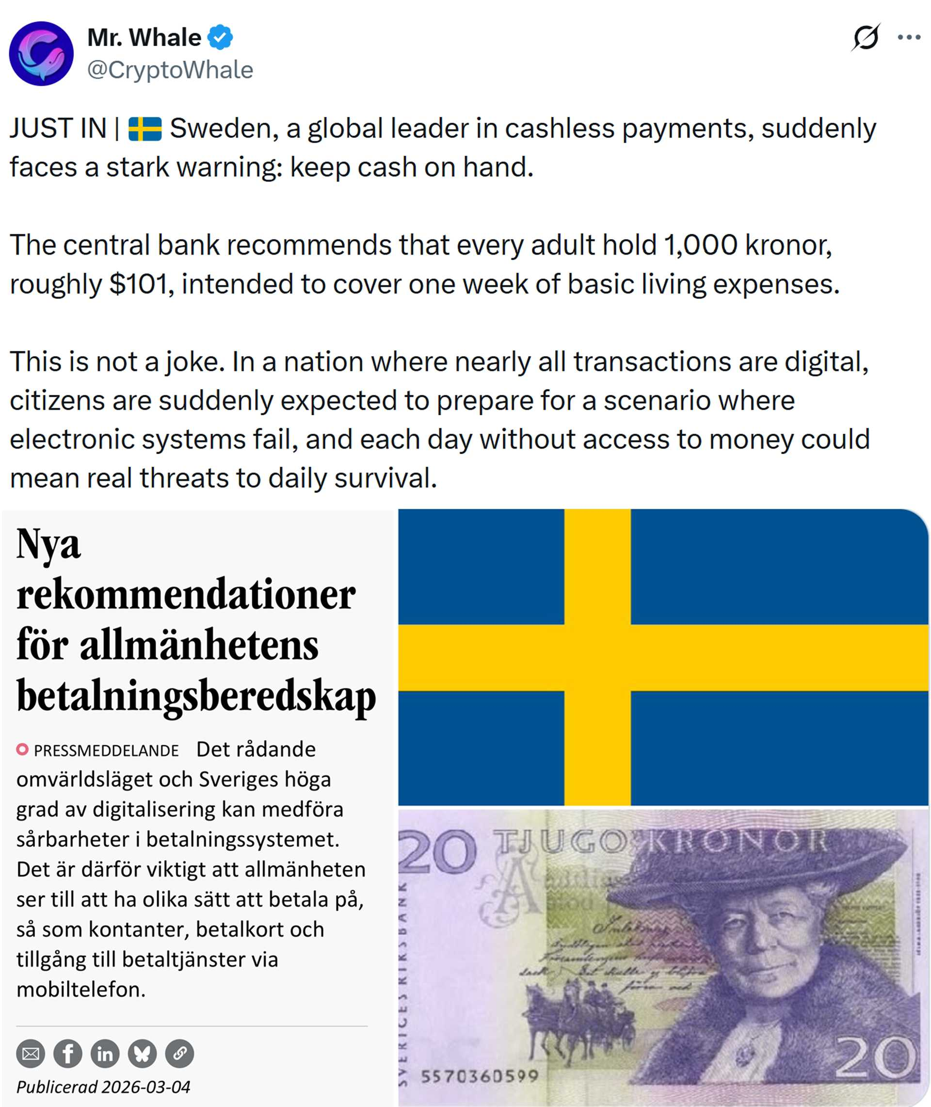 "Sweden, a global leader in cashless payments, suddenly faces a stark warning: keep cash on hand."