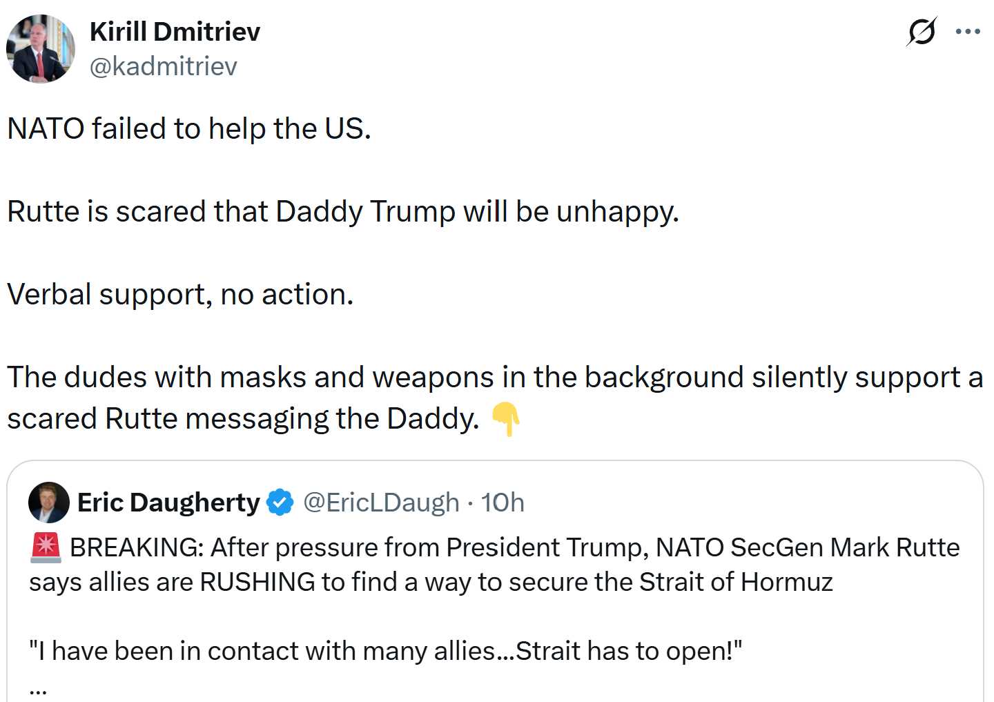 "NATO failed to help the US. Rutte is scared that Daddy Trump will be unhappy."