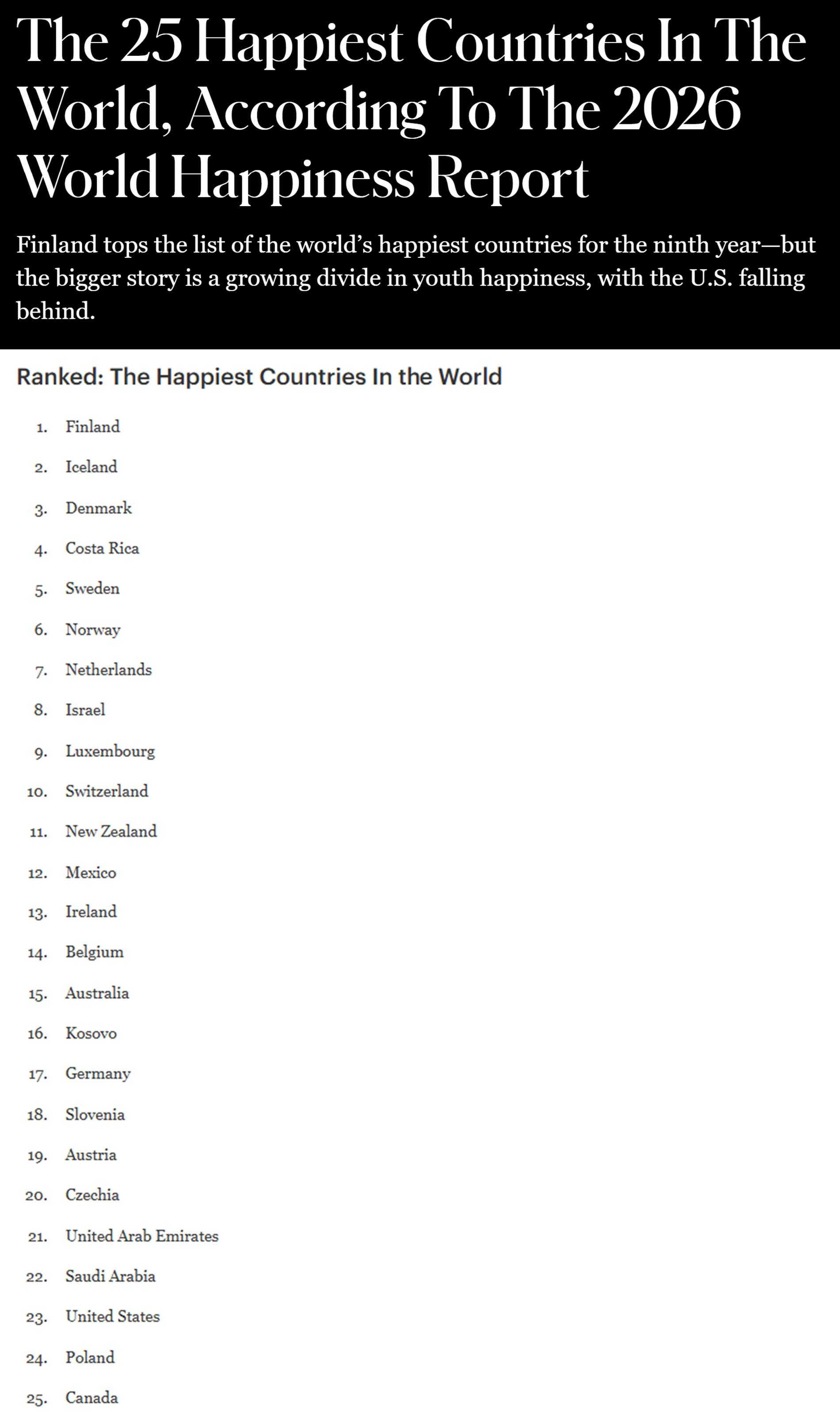 https://www.forbes.com/sites/laurabegleybloom/2026/03/18/the-25-happiest-countries-in-the-world-according-to-a-2026-report/