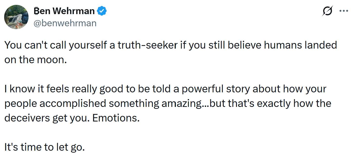 "You can't call yourself a truth-seeker if you still believe humans landed on the moon."